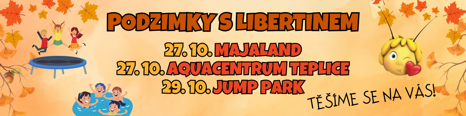 Užijme si podzimní prázdniny akčně! Plánujeme celodenní výlet do zábavního parku Majaland v Praze. Tak si to nenech ujít! Sraz bude v 7:30 - 8:00 v DDM Libertin, poté nás autobus od KD Crystal odveze do Prahy přímo k zábavnímu parku, který leží v Tuchoměřicích u Prahy v POP aréně. V parku si děti mohou užít neomezenou zábavu ve formě různých atrakcí, skluzavek, kolotočů aj. POZOR! Atrakce jsou výškově omezeny. U drobnějších dětí zvažte zda mohou na dostatek atrakcí. Ať pak nejsou zklamané. Na stránkách https://pop.cz/majaland/atrakce/vsechny naleznete u každé atrakce informace. Návrat kolem 16 hod ke KD Crystal, kde si děti ideálně vyzvednete. V ceně výletu je zahrnuta objednaná autobusová doprava a vstupné. S sebou dětem drobné kapesné na něco dobrého nebo drobnost v krámku s hračkami + svačinu a pití na celý den (v ceně není zahrnut oběd). Dětem, který bývá špatně v autobuse doporučujeme kinedryl před cestou a i s sebou na cestu zpět. Pokud máte jakékoliv dotazy neváhejte nás kontaktovat na e-mail veris@libertin.cz Těší se na Vás Adél, Týnka, Štěpka a Péťa!