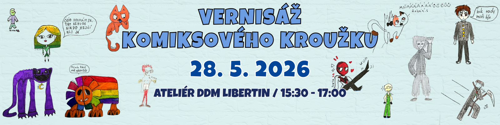 Srdečně zveme veřejnost na vernisáž komiksového kroužku, kde představíme výběr z prací vzniklých během školního roku 2025/2026. Návštěvníci budou mít možnost nahlédnout do autorských komiksů různých forem a témat. Zveřejněna bude také komiksová štafeta, kterou děti tvořili společně během celého roku. Dotazy pište na hynkova@libertin.cz