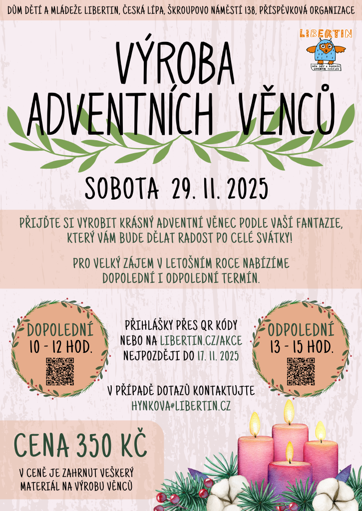 Vstupné 350 Kč. V ceně je zahrnut veškerý materiál potřebný k výrobě adventního věnce.