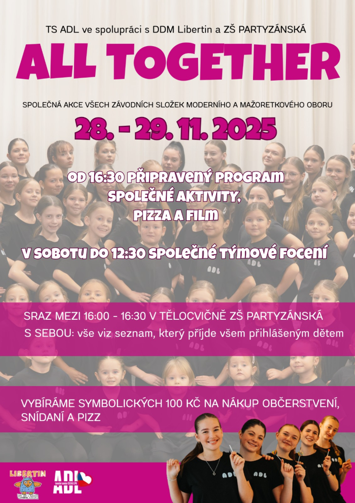 Tradiční nocovačka, již 3. ročník společné akce "ALL TOGETHER", jejímž cílem je společně poznání a sblížení se se všemi mažoretkovými a modernovými složkami napříč celým souborem ADL.